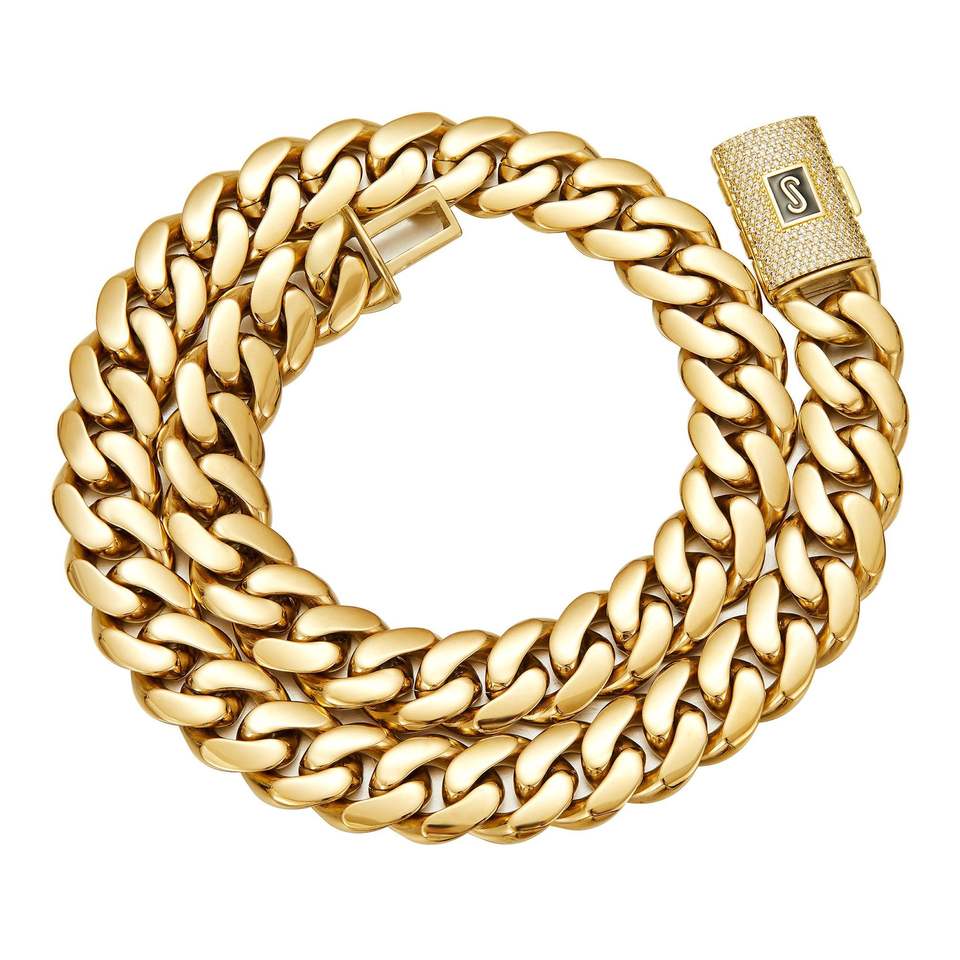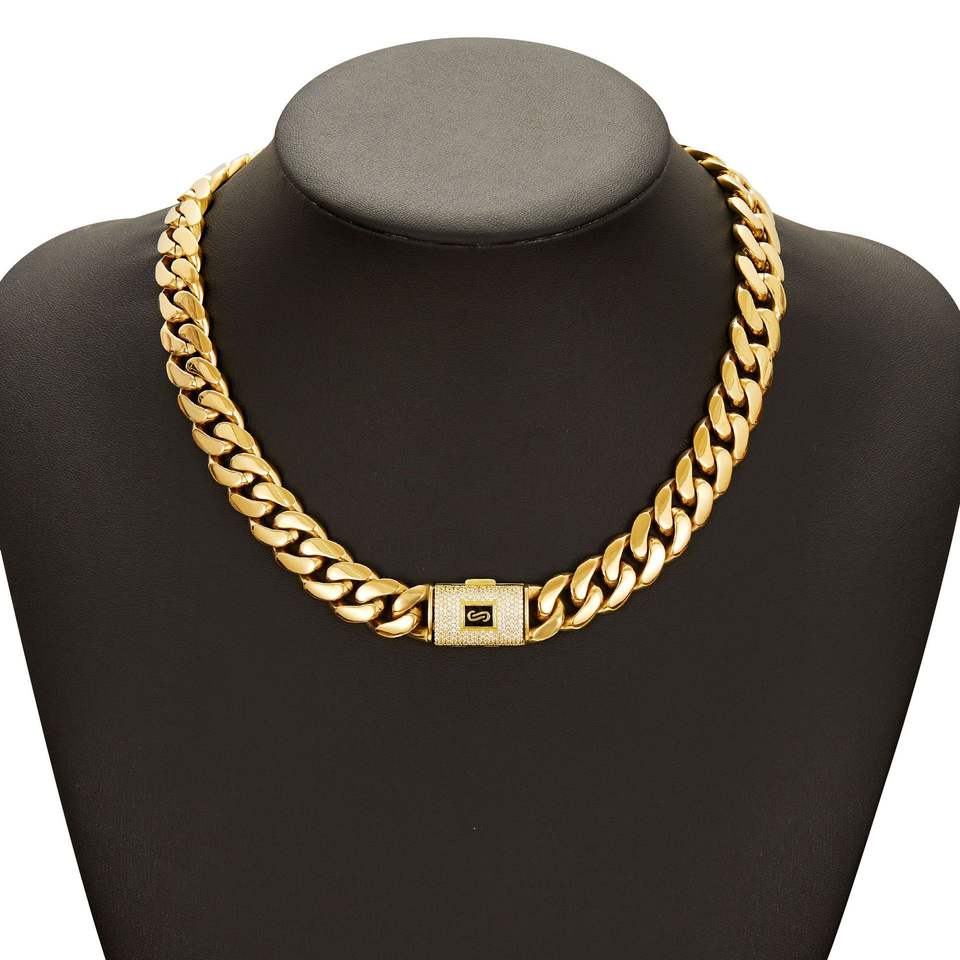 Collar de Cadena Cubana Plana Laminada de Acero Inoxidable Grueso de 14 mm con Cierre de Caja y Circonitas Cúbicas Estilo Hip Hop, Chapado en Oro de 14K para Hombre