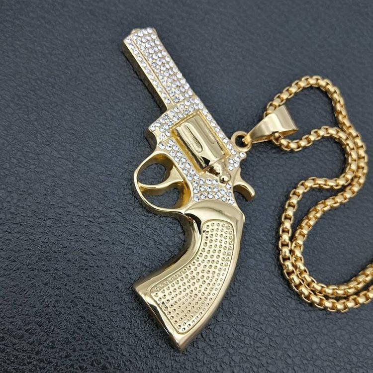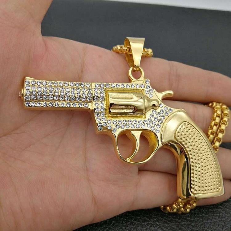 Hip Hop Revolver Pistol Gun Rock Rapper Iced Out Zirconia Pvd Acero inoxidable Joyería de moda Collares con colgante Chapado en oro de 18 quilates
