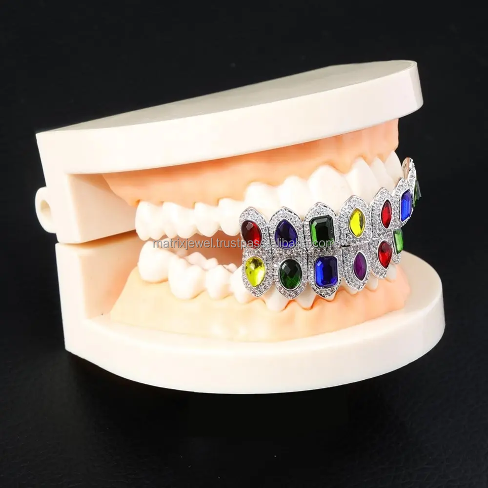 Hip Hop dientes Grillz Set colorido piedra preciosa parrilla dientes Grillz dientes tapas Iced Out Moissanite diamante plata dientes Grillz joyería