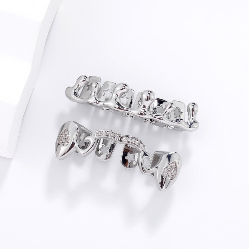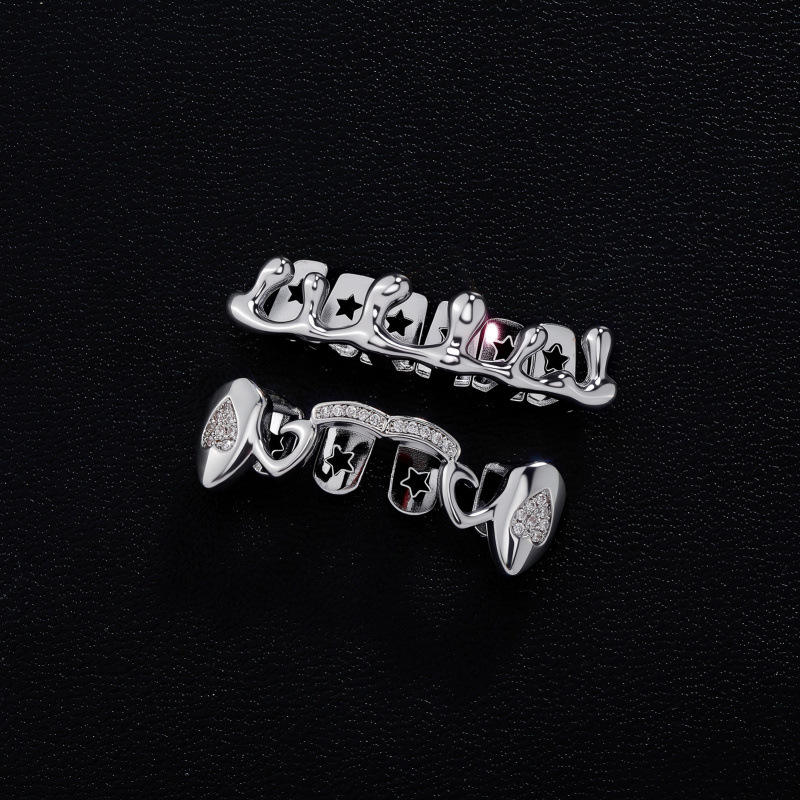 Joyería de fiesta: Grillz dentales de Hip Hop con patrón de estrellas, de aleación de zinc plateada, con engaste de canal en forma de lágrima G 026HCG 322