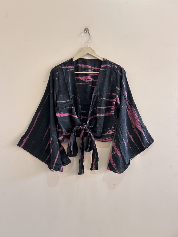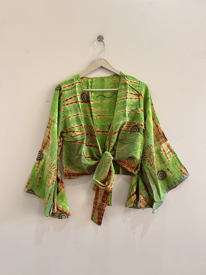 Top de Seda Crepé con Estampado Tie-Dye y Manga Campana con Cuello en V para Mujer, Estilo Hippie Retro, Ropa de Playa, Atuendo Vacacional