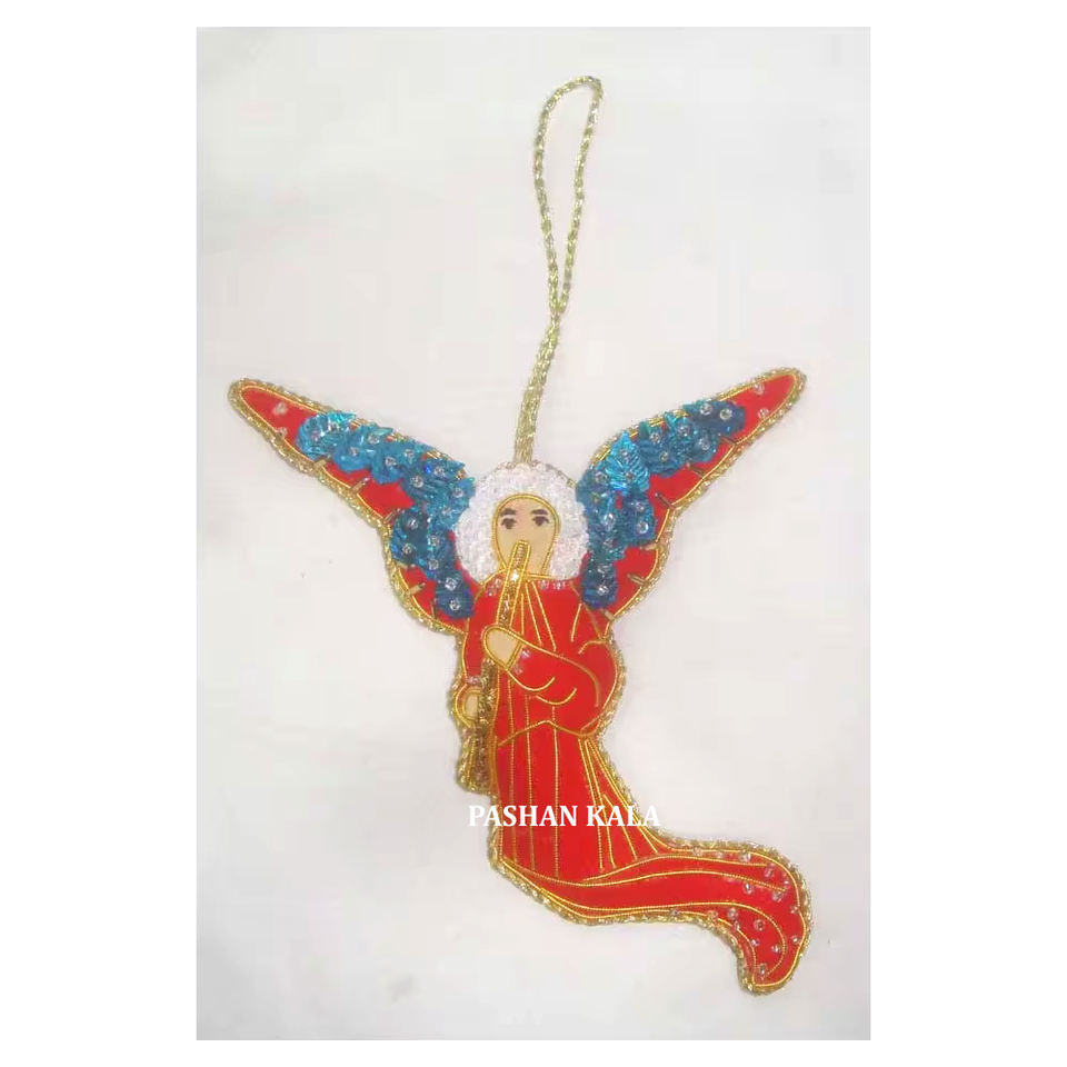 Figura artesanal de decoración del hogar, Ángel volador con flauta de juego en tela, bordado Zari y trabajo con cuentas, adorno de Navidad colgante