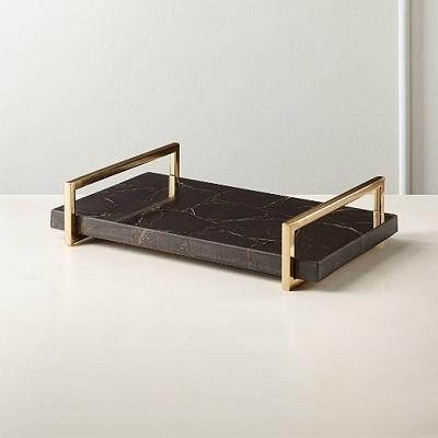 Bandeja de servicio para decoración del hogar Bandeja de mármol con acabado blanco natural con diseño funerario Mango de metal de latón dorado