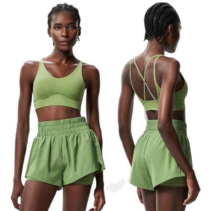 Gimnasio en casa Pilates Yoga Set Transpirable Ligero Fitness Pantalones cortos Sujetador de talla grande Pantalones cortos de secado rápido Bolsillo elástico de cuatro vías Sólido