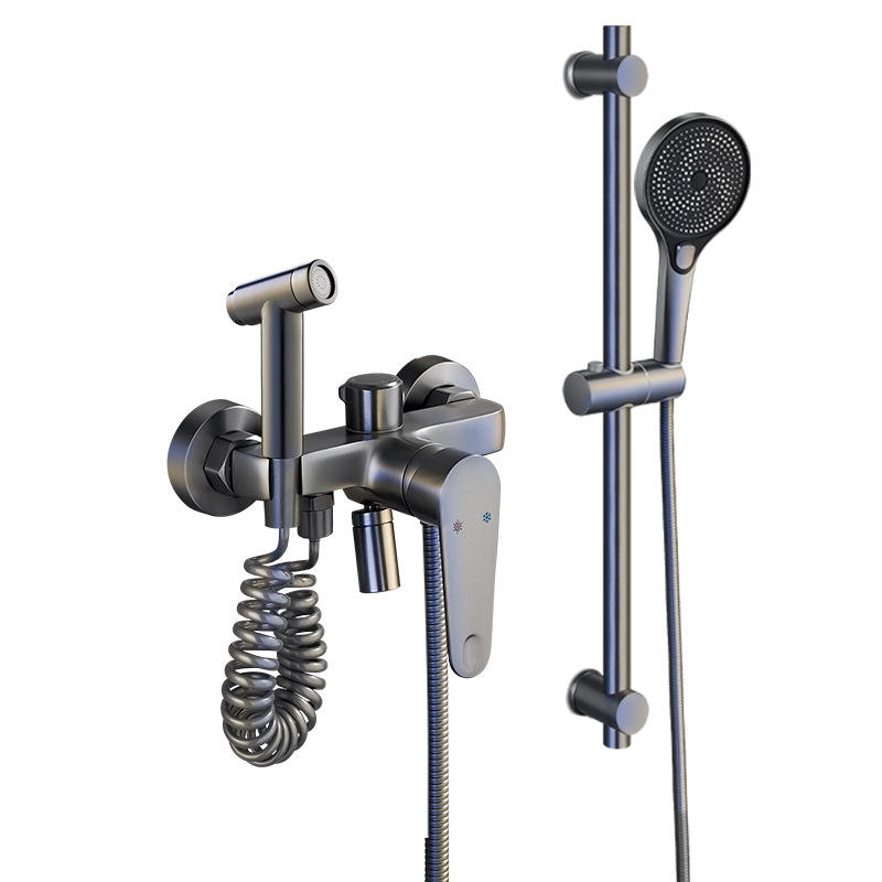 Grifo de latón de estilo simple en gris plomo con tres controles de salida de agua y juego de ducha cuadrado.