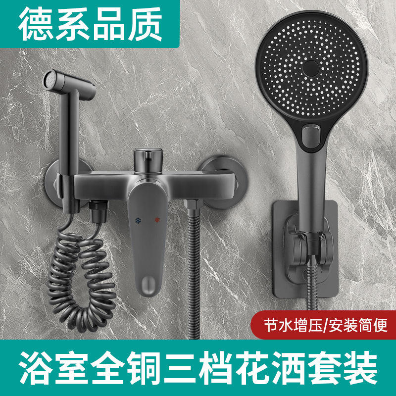[Estilo simple gris plomo] Grifo de latón con salida de agua de tres controles y juego de ducha redonda