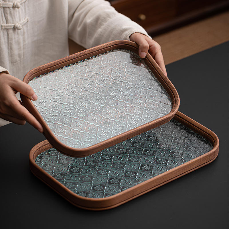 Bandeja de té de uso doméstico Vidrio y madera de inspiración china para una presentación elegante
