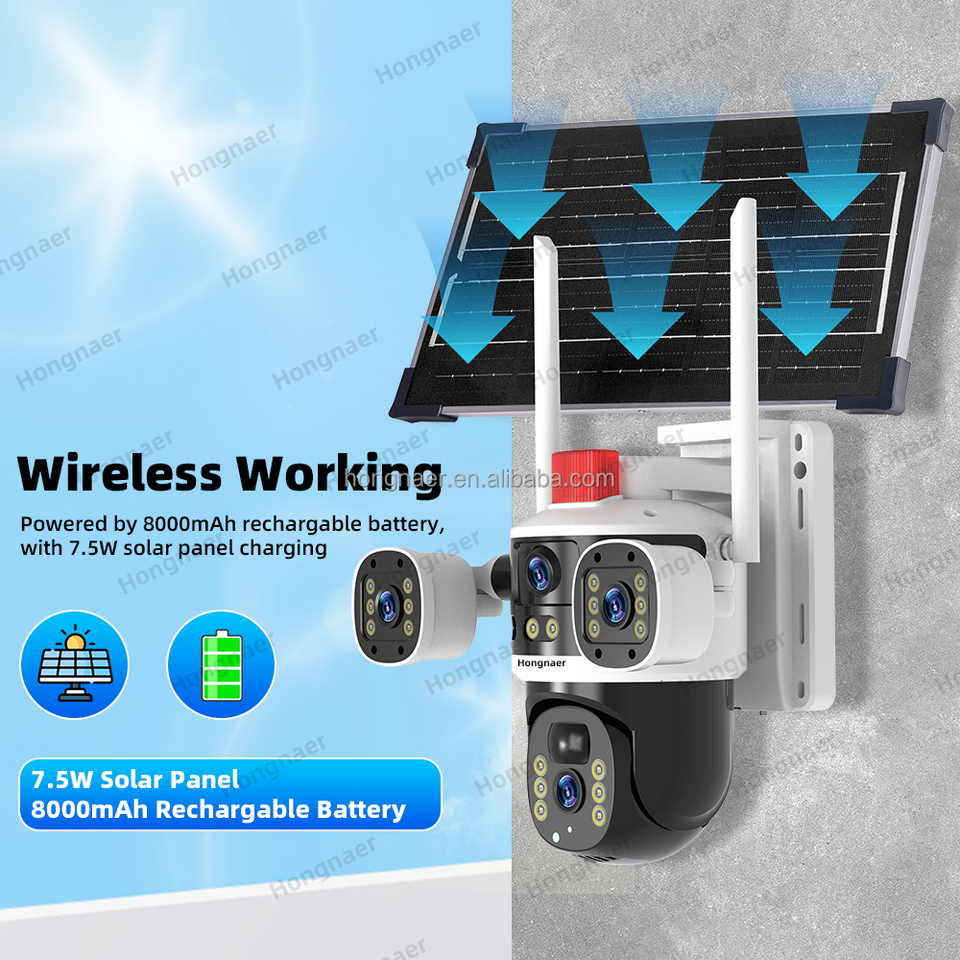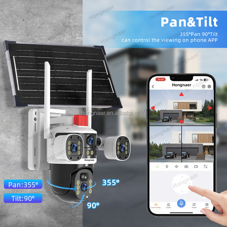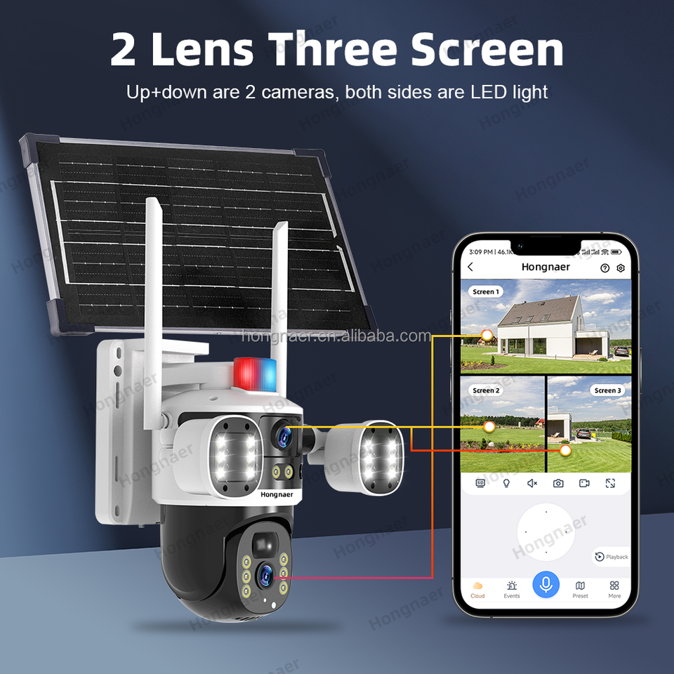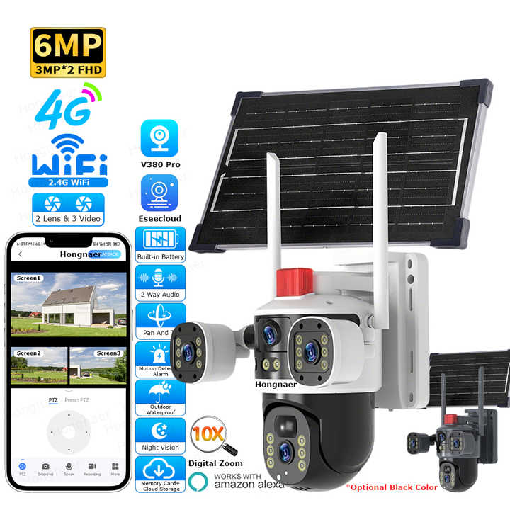 Cámara de Seguridad CCTV Solar Hongnaer 4/6MP Eseecloud/V380 Pro WiFi 4G con Tarjeta SIM, 3 Pantallas y Lente Dual para Exteriores, Hogar y Granja
