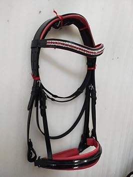Brida de Cuero para Doma Clásica Horse Beautiful, con 3 Hileras de Cuero en la Diadema y Acolchado Rojo, Cabezada de Cuero para Caballos