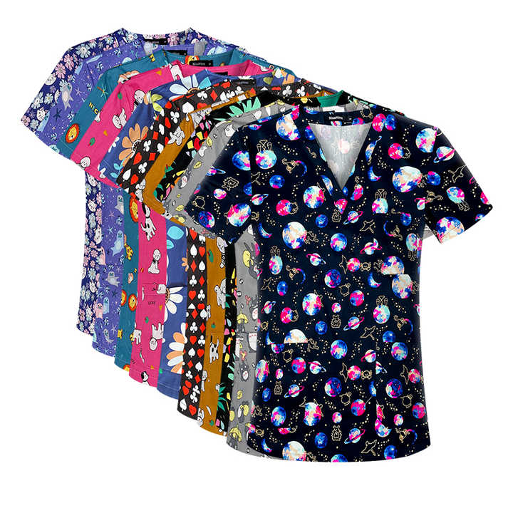 Hospital impreso Scrubs uniforme patrón estampado Scrub Top para mujeres impreso Scrubs Top médico
