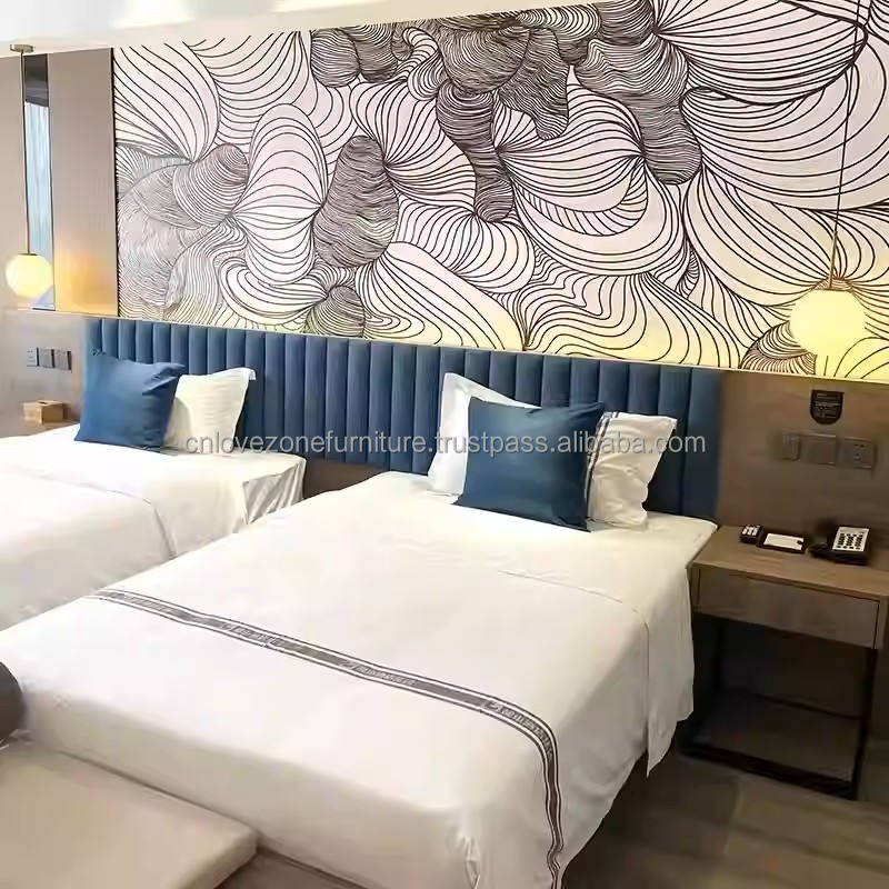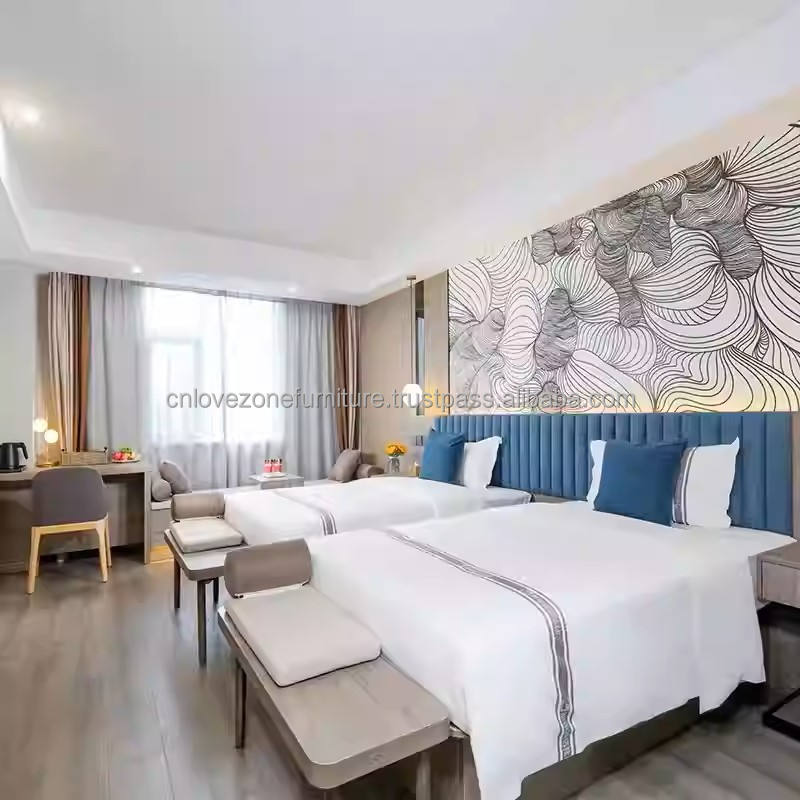 Fábrica de Muebles para Proyectos Hoteleros: Juegos Completos de Dormitorio para Hotel de 3 Estrellas con Estructura de Cama de Madera, Cabecero, Banco y Mesitas de Noche