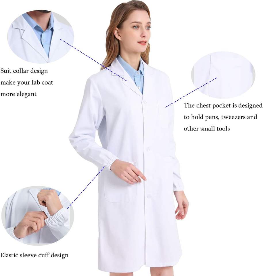Telas de Bata de laboratorio duraderas para hospitales para uso prolongado, bata médica polivinílico de algodón de manga larga, uniforme de batas de laboratorio Unisex blanco