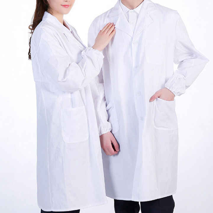 Telas de hospitales para uso prolongado de manga larga de algodón polivinílico Durable Bata de laboratorio Bata médica Blanco Unisex Batas de laboratorio Uniforme