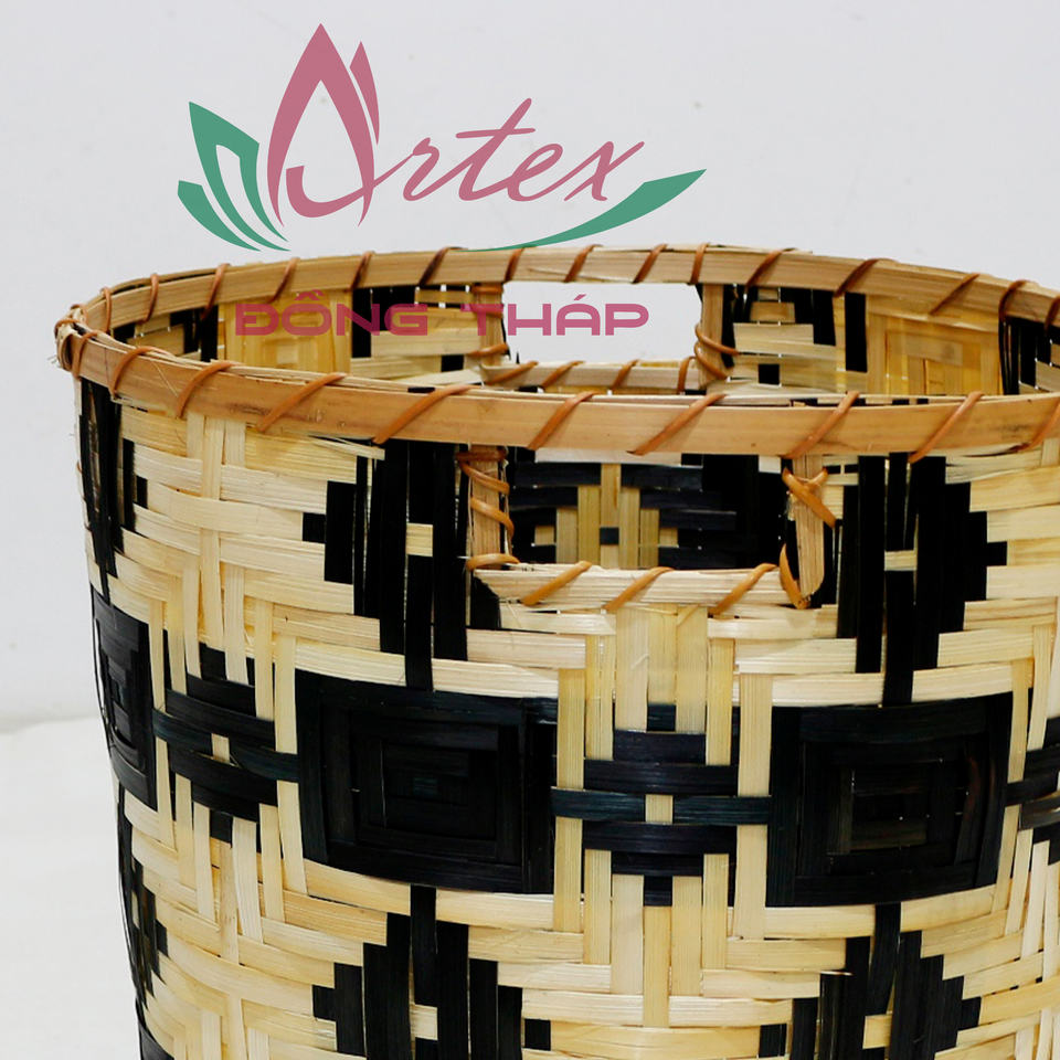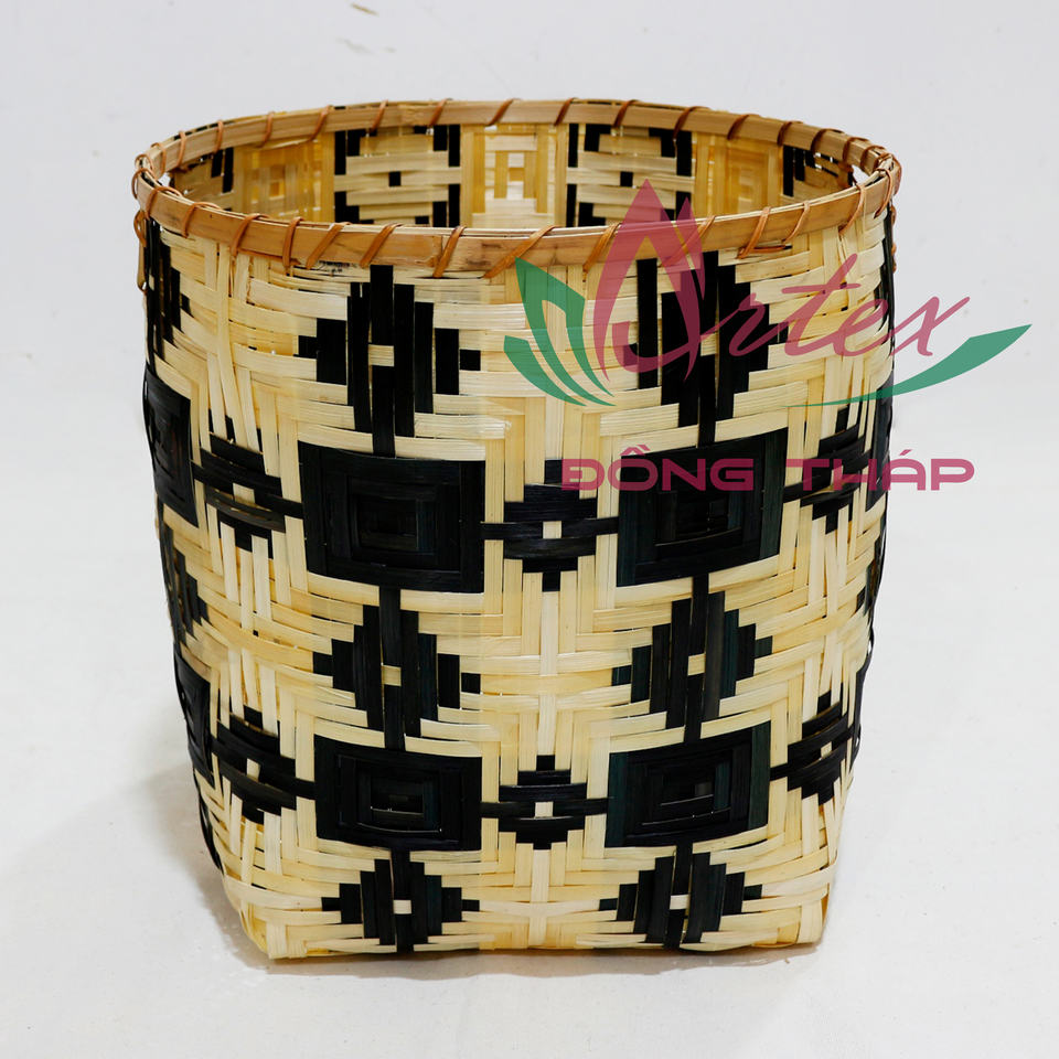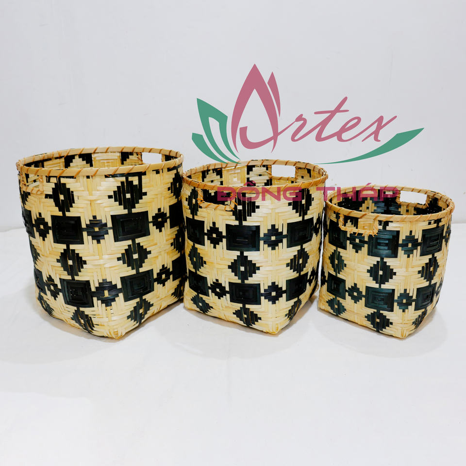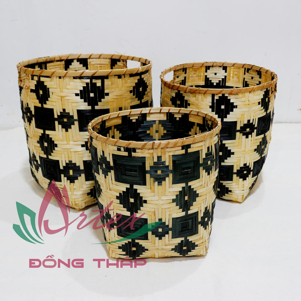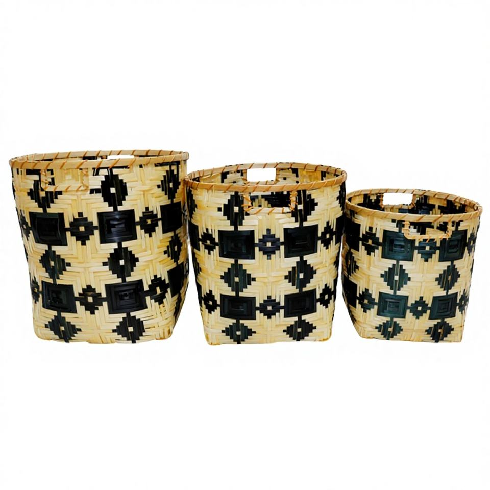 Juego de 3 cestas de bambú con tapa redonda y base cuadrada.
