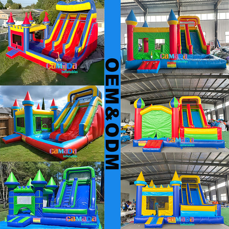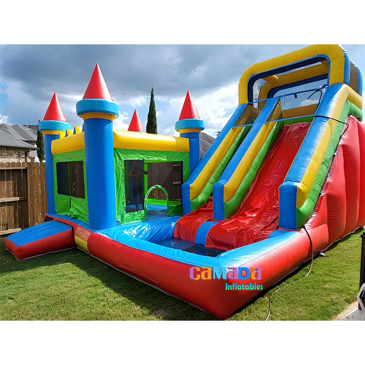 Castillo Inflable Comercial de Diseño Moderno, Directo de Fábrica, Rojo y Azul, Combinación de Tobogán Acuático y Piscina, en Venta