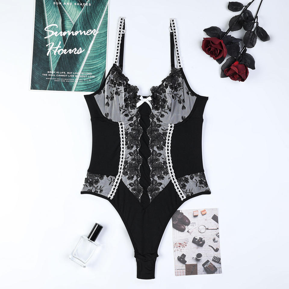 Mono con tirantes elásticos de retazos Bordados florales, mono con lazo de nuevo diseño con medias de red
