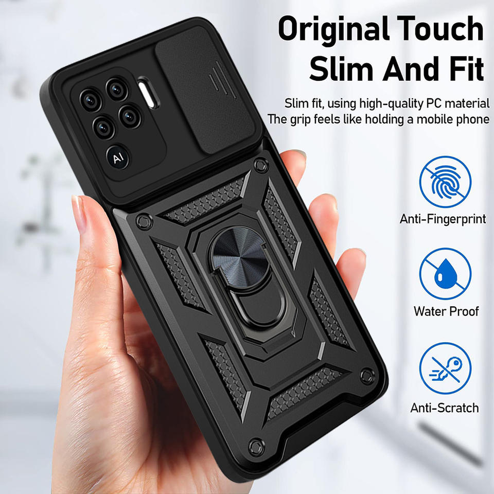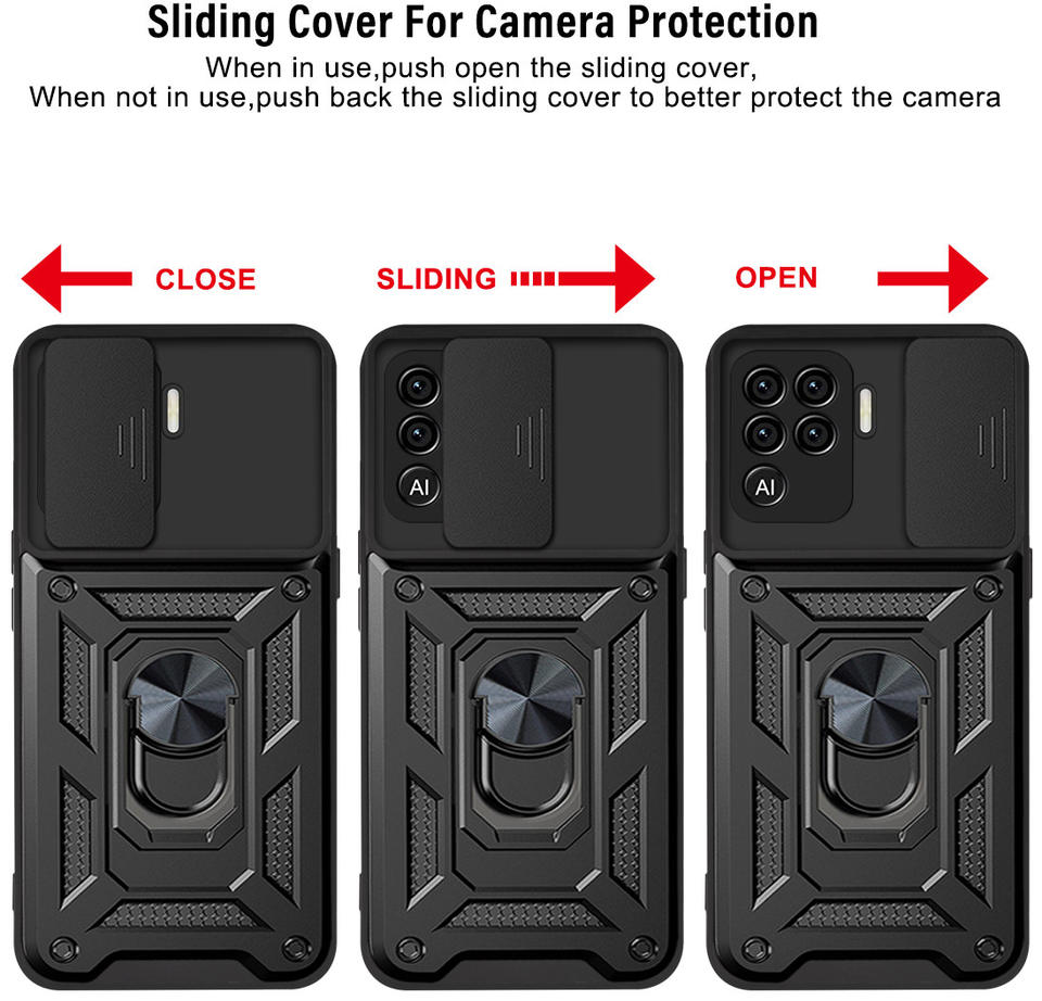 Funda trasera de PC + TPU de buena calidad para Oppo A94 con soporte de anillo y cubierta de cámara deslizante, y hierro magnético.