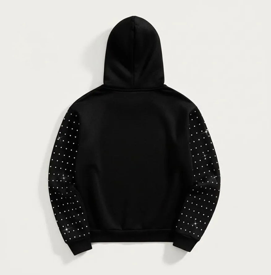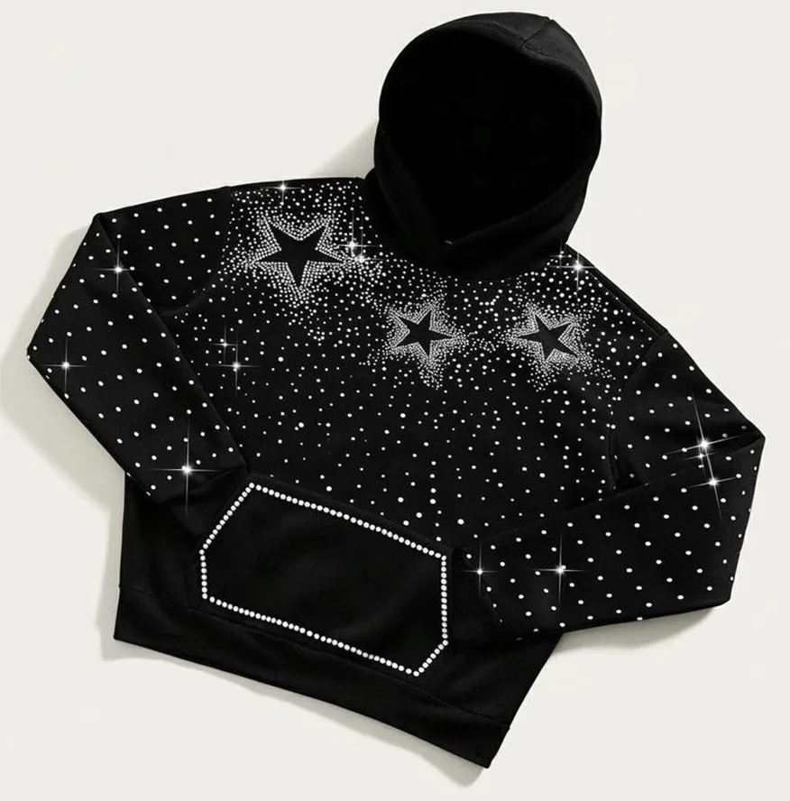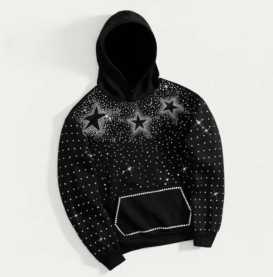 Sudadera con Capucha Negra con Pedrería en Forma de Estrella, Unisex, Impermeable, Transpirable, de Invierno, Tejida, de Poliéster/Rayón, con Cristales Brillantes