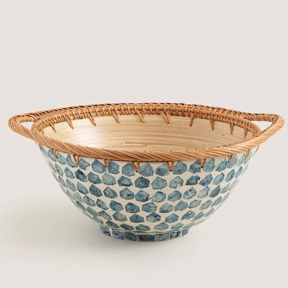 Caliente nuevo hecho a mano bambú ratán y madre de perla incrustaciones cuenco decorativo para mesa de comedor estilo y exhibición de decoración del hogar
