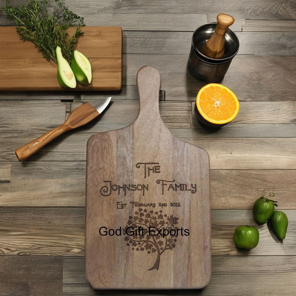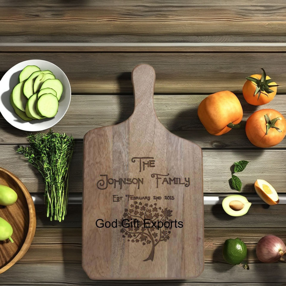 Gran oferta, bloque de cortar de madera de acacia, stock en almacén, tabla para servir pizza y charcutería con asa para uso doméstico en la cocina