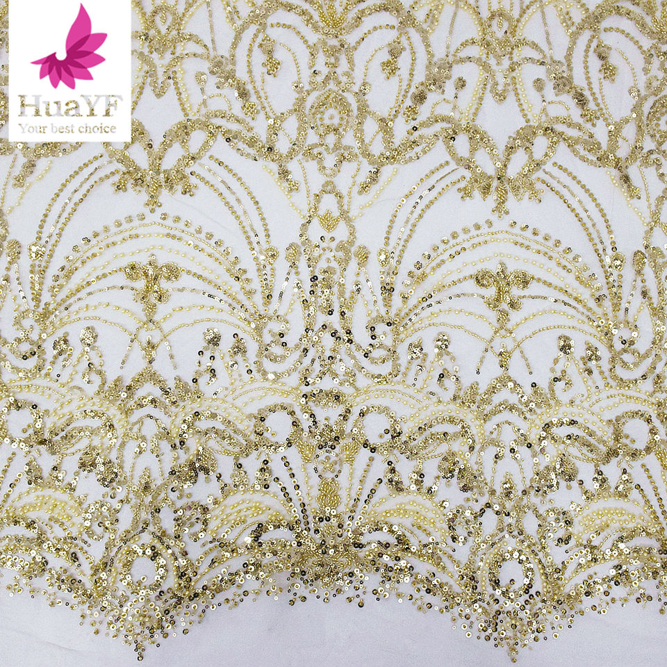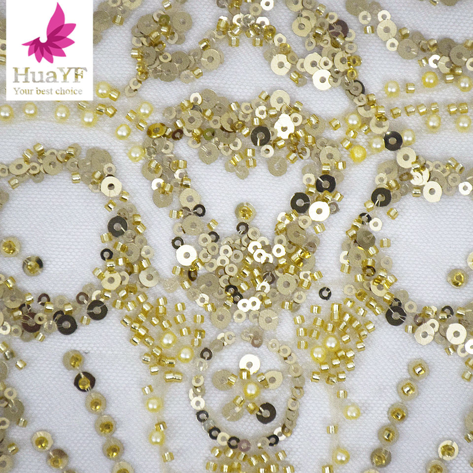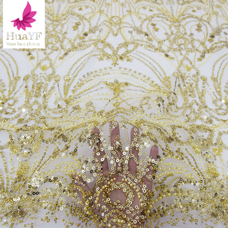 Venta caliente Oro africano 3D lentejuelas con cuentas perlas tela de encaje vestido de novia boda Aso Ebi HY2219