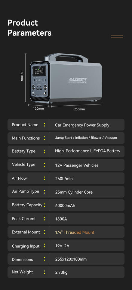Arrancar el coche / Inflado de neumáticos / Succión de aire / Batería externa portátil