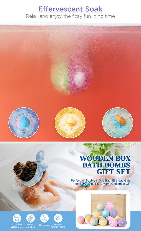 Venta caliente personalizado colorido Soda Salt Bath Fizzies Set Etiqueta Privada baño de burbujas para regalo caja de madera estilo de corte competitivo