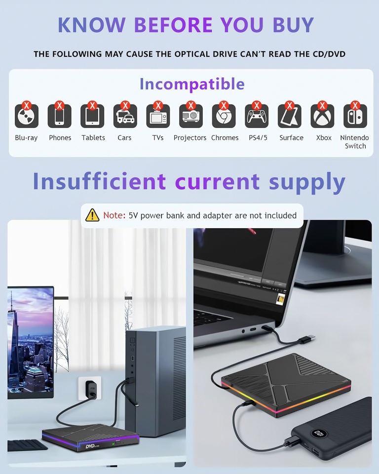 DVD-ROM, DVD-R, DVD+R, DVD-RW, DVD-R DLCD, CD-ROM, CD-R, VCD, CD-RW