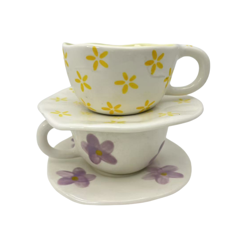 Taza de Café de Cerámica Pintada a Mano con Diseño de Flores Irregulares, Tazas Creativas, Taza de Cerámica Hecha a Mano con Plato