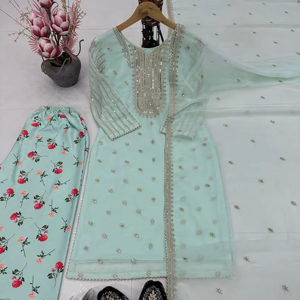 Venta caliente pesado bordado secuencia trabajo elegante Top Sharara indio largo Salwar Kameez boda fiesta desgaste seda hecha Natural