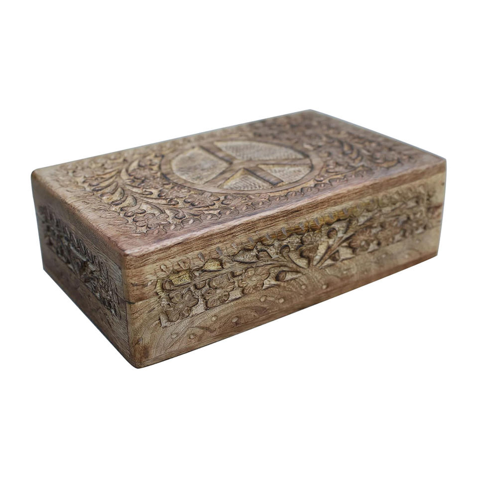 Gran oferta, caja de madera de mango, diseño de signo de la paz para decoración y almacenamiento del hogar, almacenamiento de joyas de madera y caja de regalos a precio mayorista