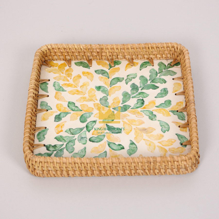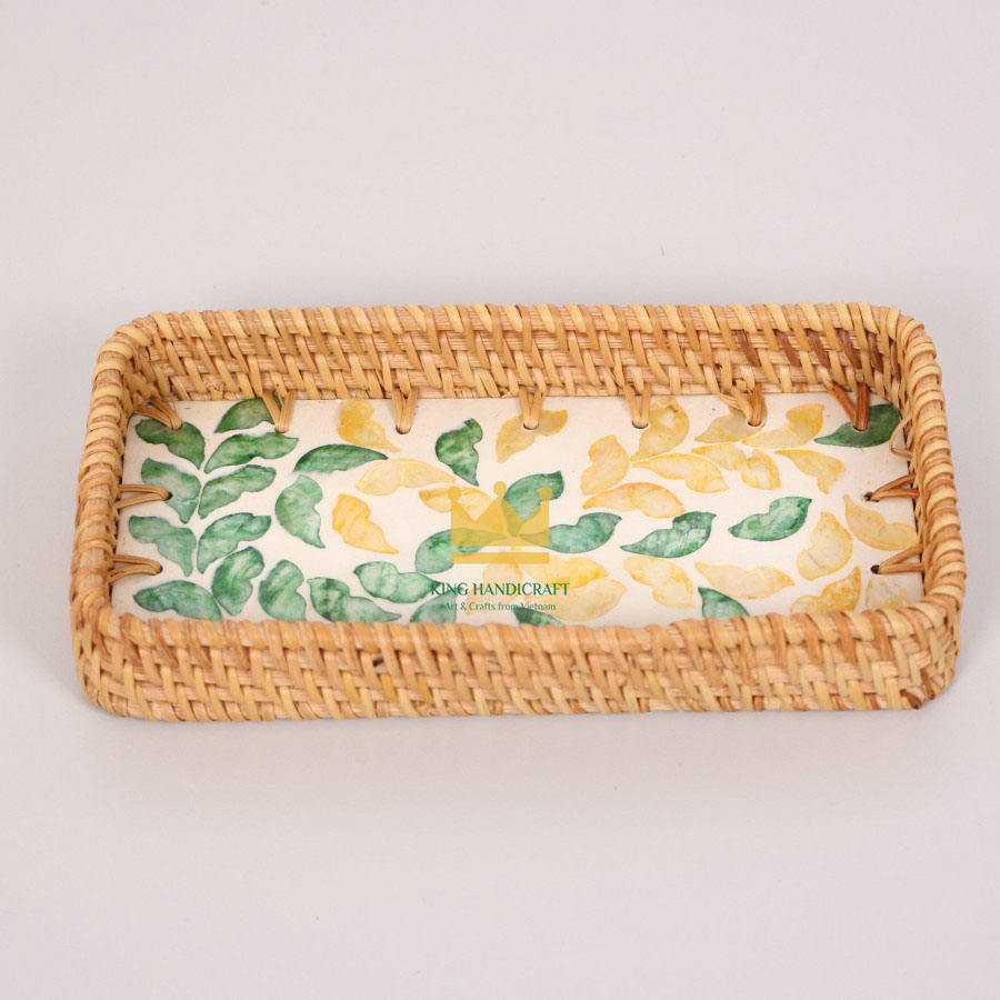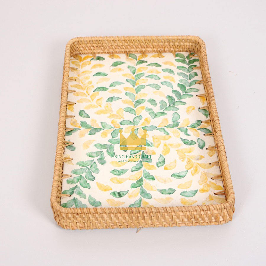 Bandeja Decorativa Rectangular Elegante de Ratán y Madreperla, Ecológica, para Hoteles y Restaurantes, Venta al Por Mayor para Exportación