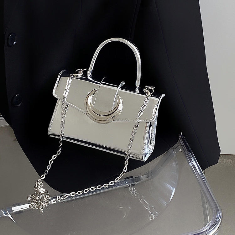 Gran oferta, bolsos con cierre de Luna para mujer, nuevos bolsos cuadrados plateados de charol para mujer, bolso de mano principal para mujer, bandolera de hombro con cadena