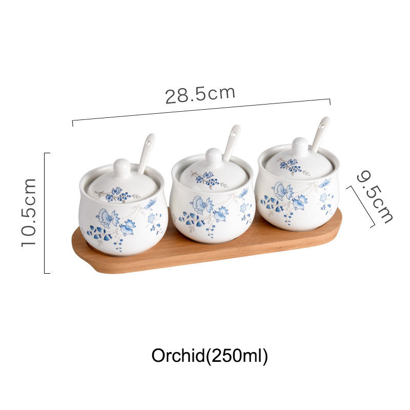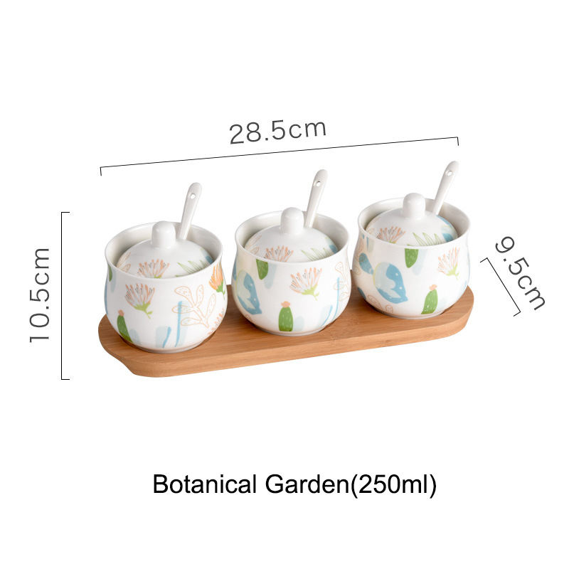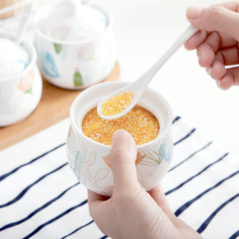 Nombre del producto:Elegante juego de 3 piezas de cerámica para especias y sal, con cuchara y bandeja.