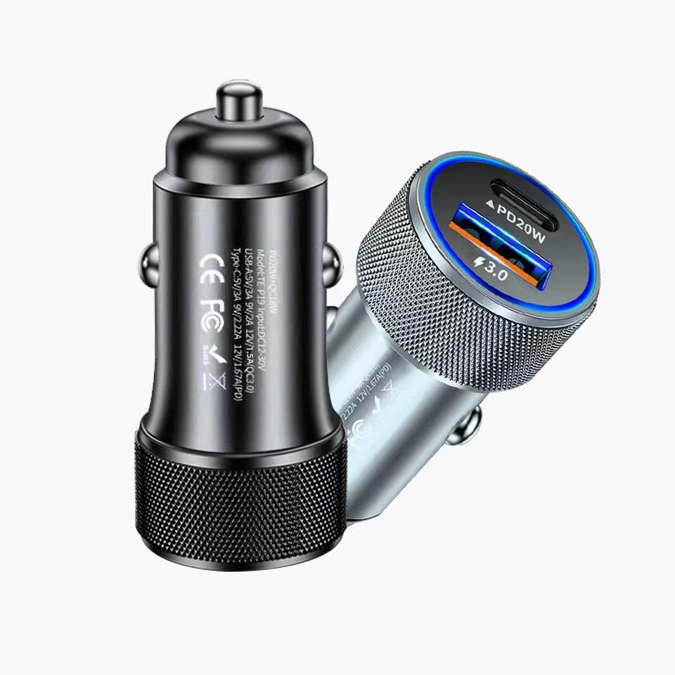 Cargador de Coche 2 en 1 Tipo C PD de 38 W, Carga Rápida de 20 W + QC3.0, Doble USB para Teléfonos Móviles y Dispositivos, Metal Negro/Blanco