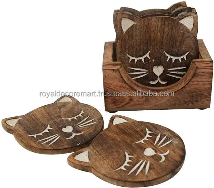 Venta caliente Posavasos de madera con cara de gato de 5mm de espesor Tapetes y almohadillas de mesa libres pulidos naturales Diseño exclusivo de Royal Decore Mart