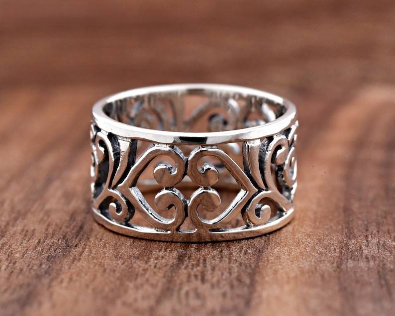 Venta caliente 925 plata esterlina minimalista filigrana corazón corte anillo 10mm ancho delicado mujer aniversario declaración pulgar banda