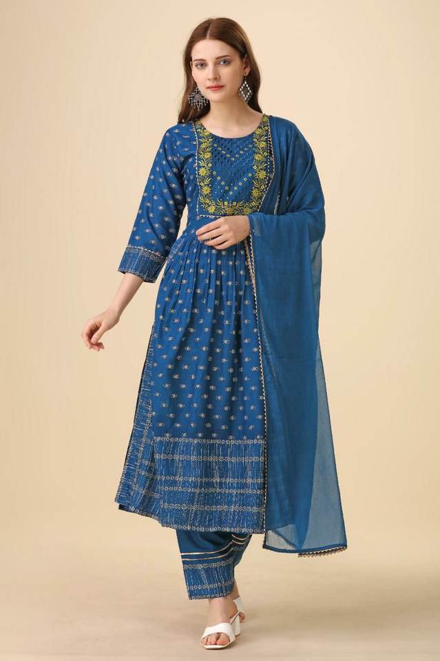 Venta caliente Anarkali Reyon Gold Foil Print Set Indian Wear con hermosa Dupatta hecha de tela de red de seda