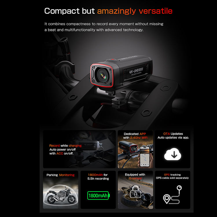 Construir en GPS, Construir en WiFi, A todo color, Sensor G, Grabación en bucle, Detección de movimiento, Visión nocturna, Parque de modo, Control remoto, La voz de interacción, Impermeable, Control de App, De emergencia de Accidente de bloqueo, Construir-en la bateríaFunción
