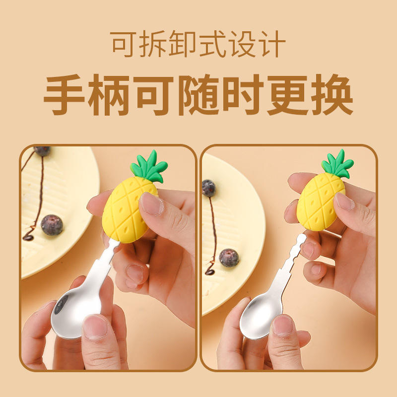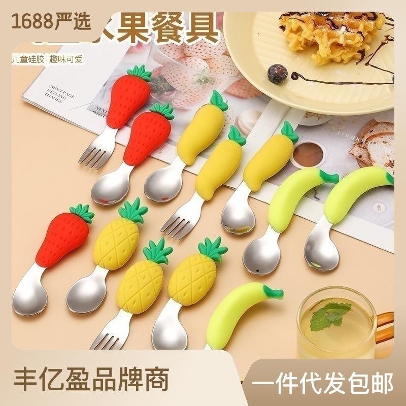 Venta caliente dibujos animados lindo fruta vajilla bebé cuchara silicona 304 Acero inoxidable dibujos animados para niños sopa cuchara tenedor