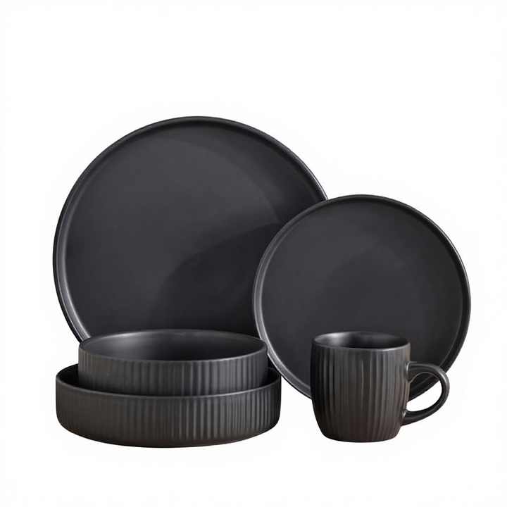 Juego de Vajilla de Cerámica de Gres Esmaltado en Color Negro con Relieve, Económico y en Oferta, para 4 Personas, 20 Piezas, Apto para Lavavajillas