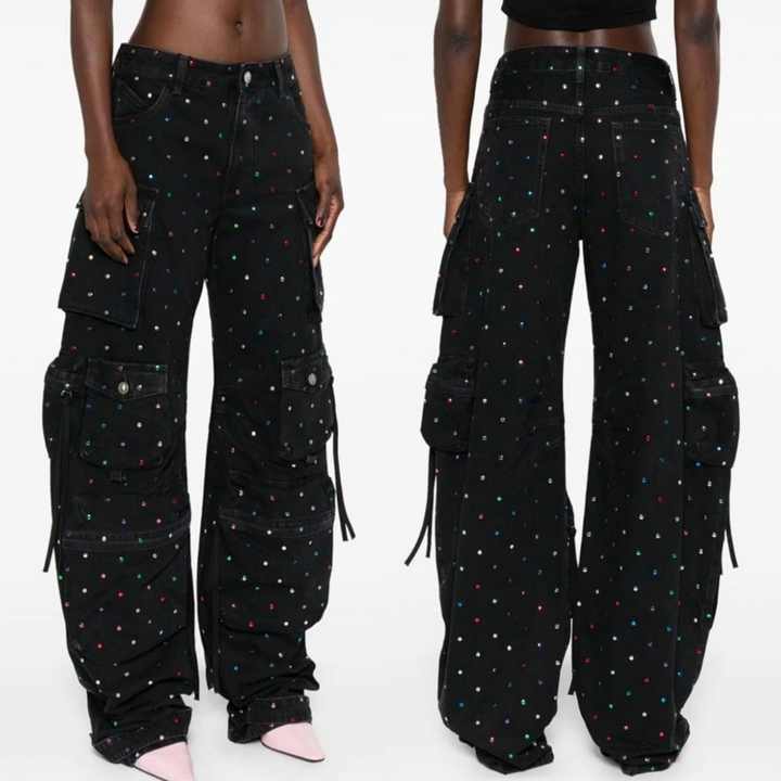 Jeans Anchos Negros con Pedrería de Colores, de Alta Calidad, para Mujer, con Múltiples Bolsillos, Estilo Cargo