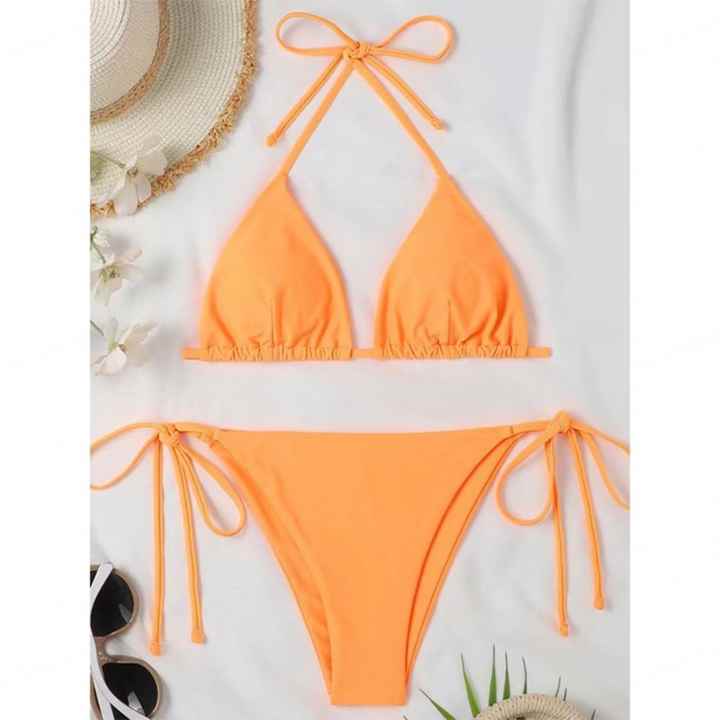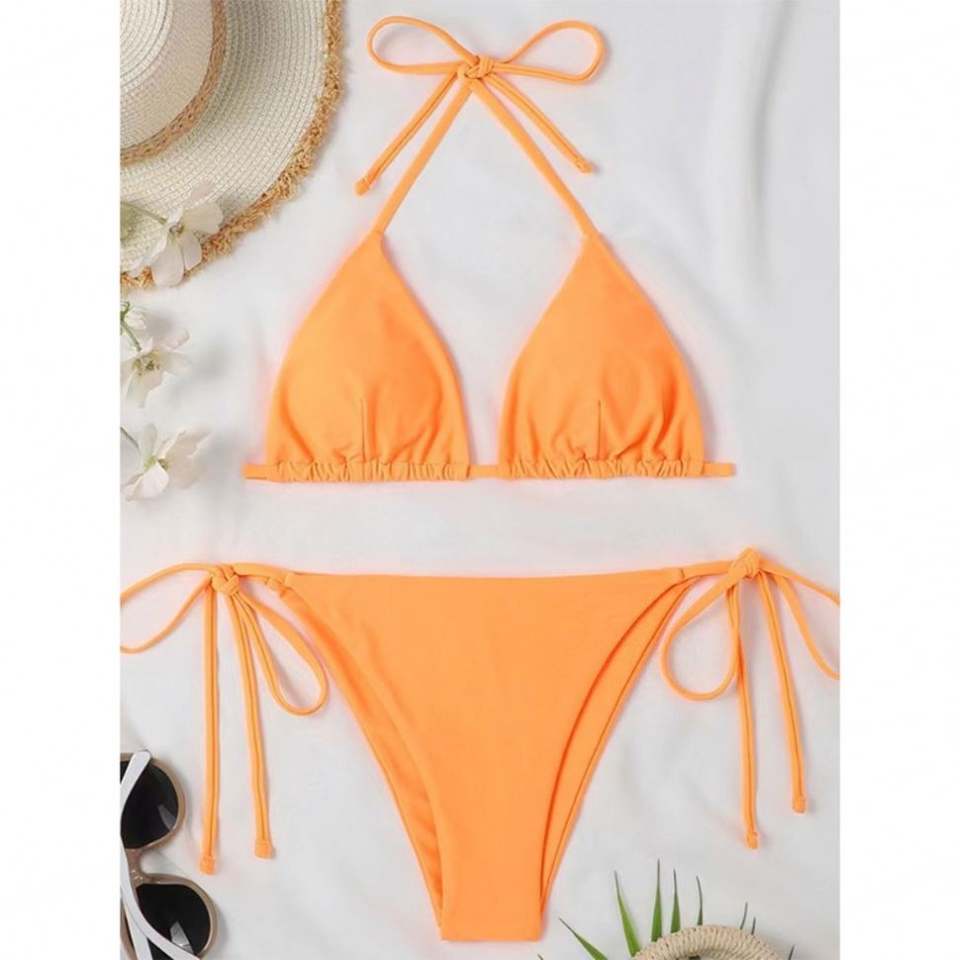 Traje de Baño de Una Pieza con Tirantes, Color Naranja Brillante, Texturizado, Sexy, de Secado Rápido, con Sujetador Push-Up, Conjunto de Bikini Triangular