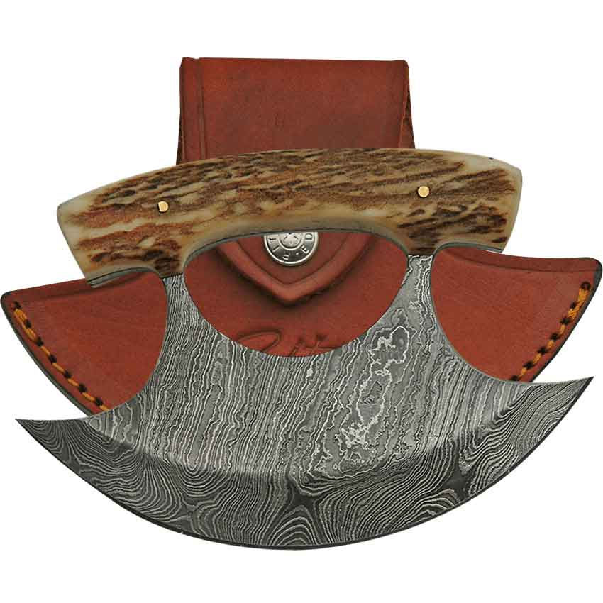 Cuchillo Ulu de Damasco forjado a mano personalizable con mango de cuerno de escenario y cubierta de cuero para uso en cocina Chef's Cleaver