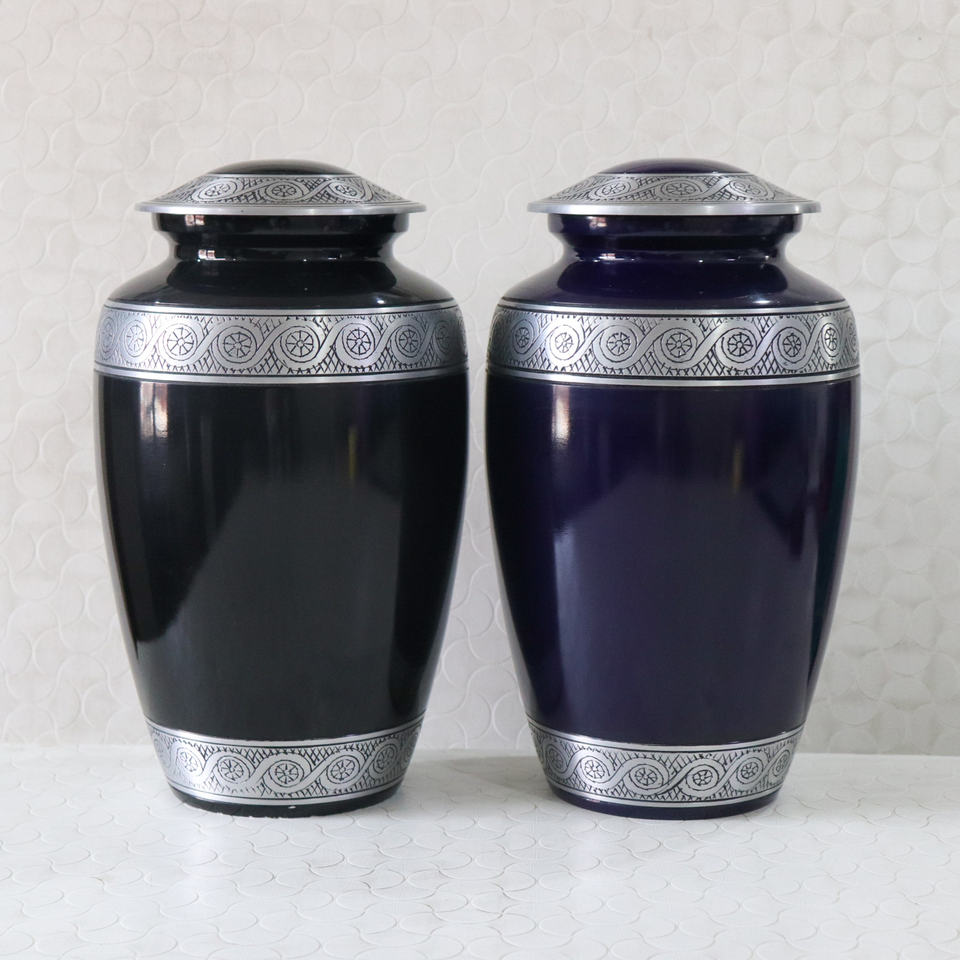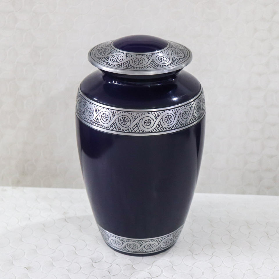 Urna Funeraria de Aluminio Clásica Grabada en Azul Oscuro, Artículos Funerarios Modernos, Urna Funeraria Aura Hecha a Mano