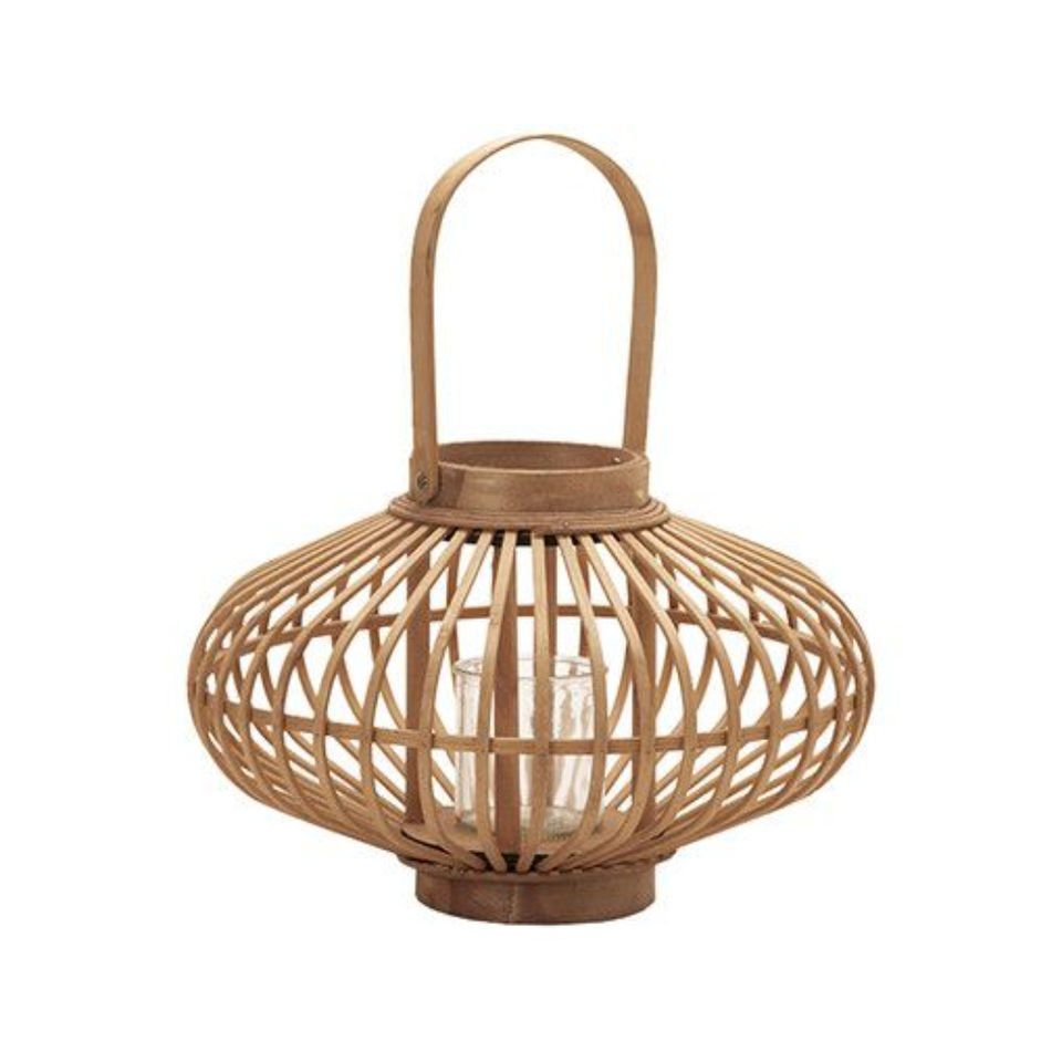 Farol de Mimbre de Bambú Tejido a Mano Decorativo, Portavelas de Madera Colgante para Interiores y Exteriores con Cristal en Venta