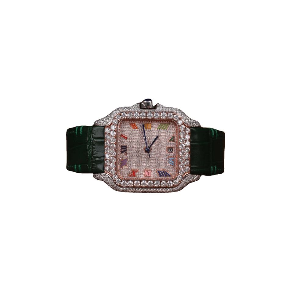 Reloj de diamantes de Venta caliente con correa de cuero Corte redondo Mitad-Iced Fecha clásica Características romanas Esfera cuadrada Relojes de moissanita