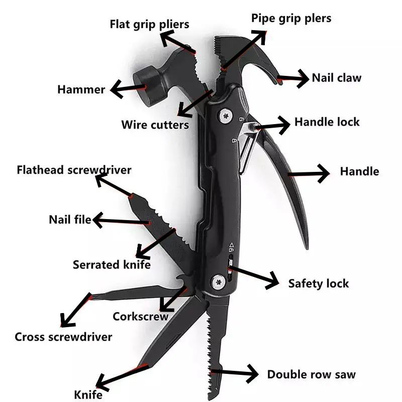 Martillo de Emergencia Multiherramienta de Acero Inoxidable Duradero y de Venta Caliente con Alicates para Acampar al Aire Libre
