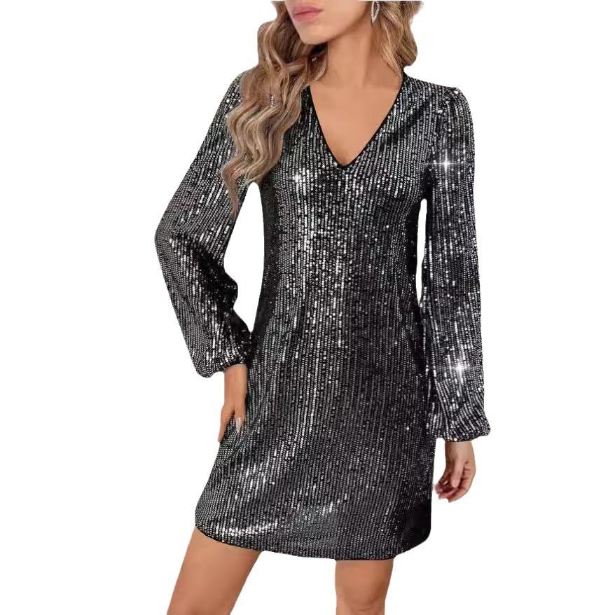 Venta caliente Europea de manga larga con cuello en V de lentejuelas Mini vestido de noche Club de fiesta de cóctel vestido pequeño