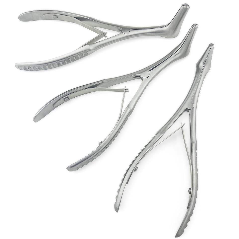 Acero inoxidable, Dos bladed o tres bladed con el mecanismo del tornillo o de la primavera, Ergonómico a menudo con tornillo de pulgar para bloqueo, Fuente de luz integrada o conectable para una mejor visibilidad